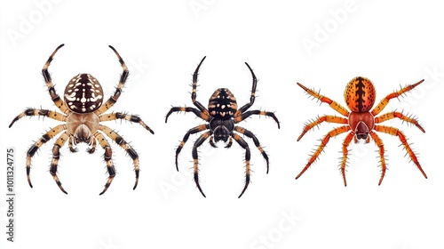 A detailed collection of 3 different arachnids with 8 legs, neatly arranged