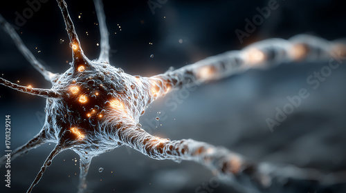 A detailed depiction of a neuron showcasing its intricate structure and glowing features, representing brain functionality and communication.