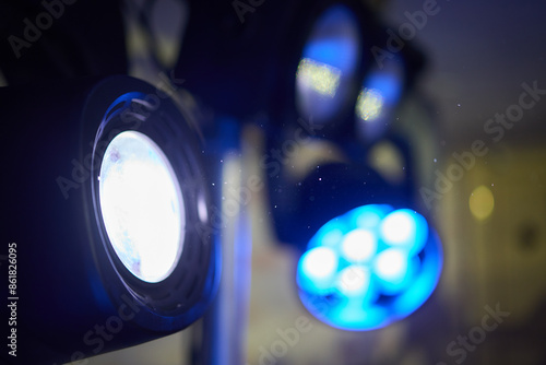 A detailed description of vibrant blue stage lights used for artistic performances