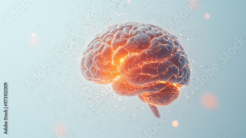 A detailed digital brain with complex neural pathways illuminated by soft light, floating against a clean white backdrop