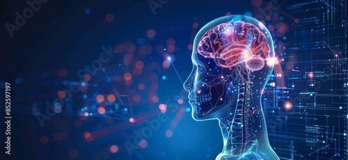 A detailed digital depiction of a human figure emphasizing the brain and nervous system, shown with bright blue and pink lines and nodes.