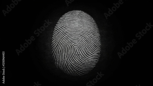 a detailed fingerprint captured in high resolution with an isolated black background. The intricate lines and whorls of the fingerprint are visible in sharp focus.