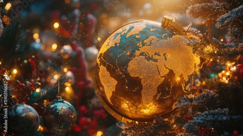 A detailed globe-shaped ornament featuring a golden world map, glowing softly against a backdrop of festive holiday decorations
