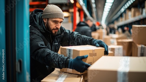 A detailed, high-quality photo of a delivery truck being loaded with boxes in a bustling warehouse. The image captures the hustle of workers wearing uniforms and gloves, carefully handling packages