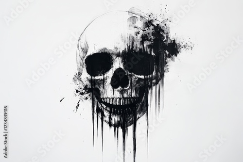 A detailed, hyper-realistic tattoo design of a skull with black liquid dripping from it, set against a white background