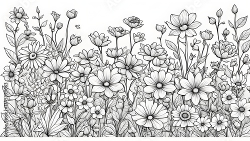 A detailed illustration a lush meadow filled various monochrome flowers, meticulously drawn a detailed line art style.