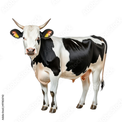 A detailed illustration of a black and white dairy cow standing gracefully on a transparent background.