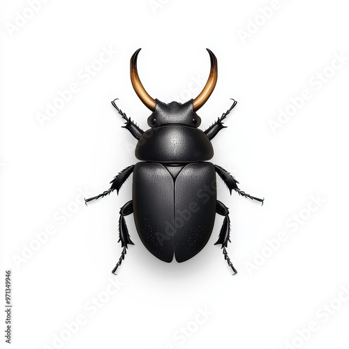 A detailed illustration of a black beetle with striking horns, showcasing intricate textures and vibrant design elements.
