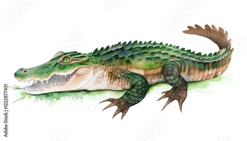 A detailed illustration of a crocodile resting on grass, showcasing its vibrant colors and textures