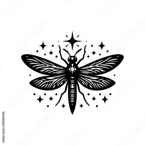 A detailed illustration of a dragonfly with starry wings