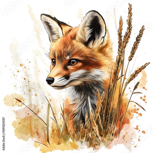 A detailed illustration of a fox amidst tall grass, showcasing its vibrant colors and features.