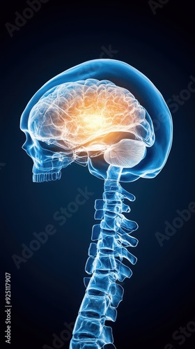 A detailed illustration of a human skull and brain, showcasing intricate neural connections and the spinal structure.