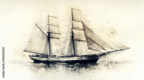 A detailed illustration of a sailing ship with multiple masts, showcasing nautical design and artistry.