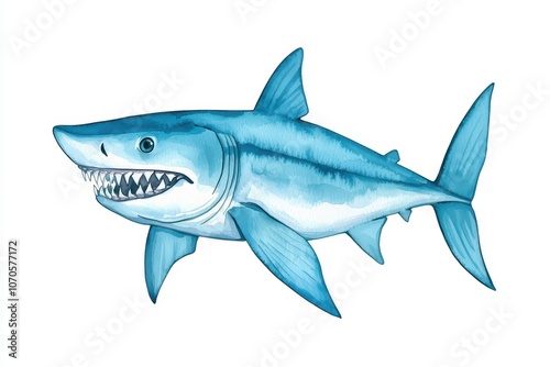 A detailed illustration of a shark with sharp teeth swimming gracefully in blue waters.