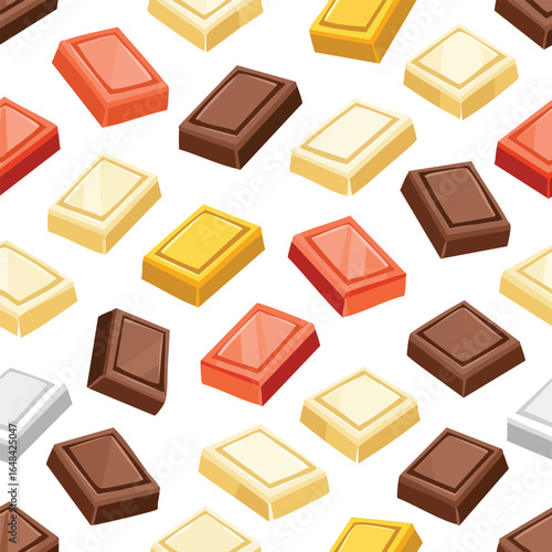 A detailed illustration of various chocolate bars arranged in a repeating pattern on a white background.