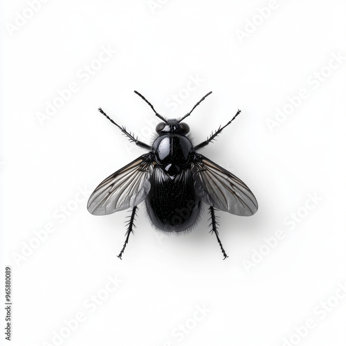 A detailed image of a housefly from a top-down perspective against a clean white background, highlighting its wings and body.
