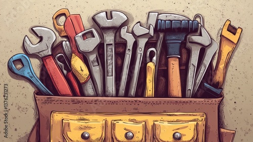 A detailed image of a tool bag filled with various tools for construction or repair tasks. illustration