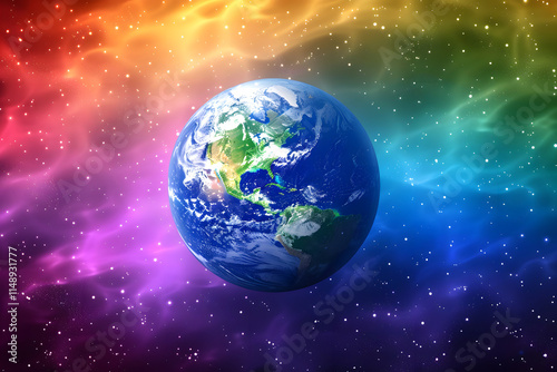 A detailed image of planet Earth surrounded by vibrant rainbow colors and cosmic stars, symbolizing unity, diversity, and global harmony
