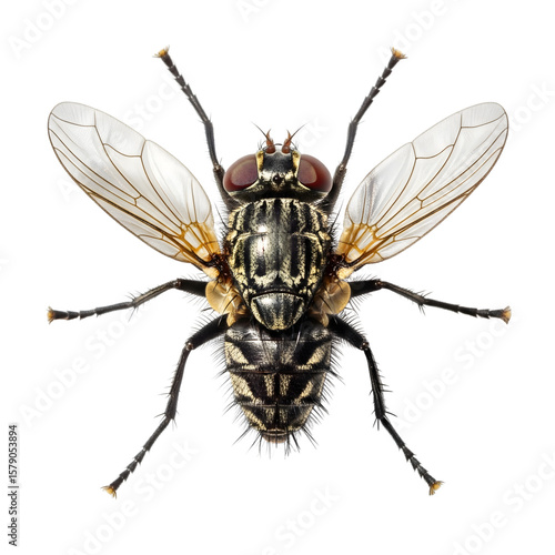 A detailed macro shot of a common housefly with patterned thorax and red eyes, isolated on transparent background