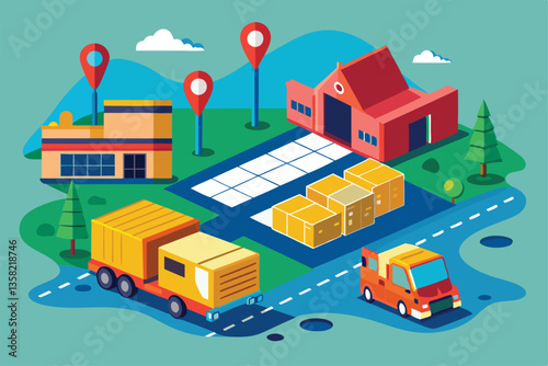 A detailed map showing a warehouse layout with trucks, parking areas, and delivery zones highlighted, Warehouse, map and truck,