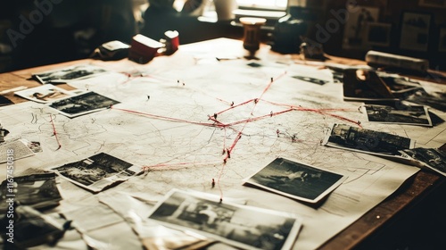 A detailed map with photographs and red lines, suggesting investigation or planning.
