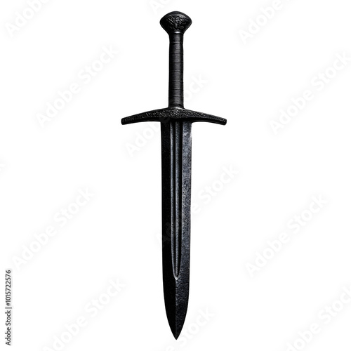 A detailed medieval sword against a white isolated background, showcasing its craftsmanship and design.