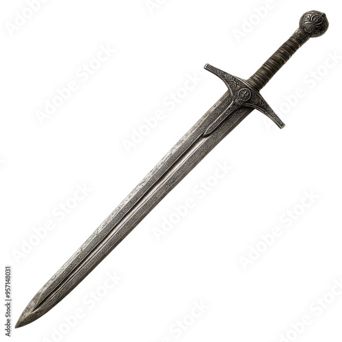 A detailed medieval sword with a silver blade and ornate hilt, perfect for historical or fantasy-themed projects.