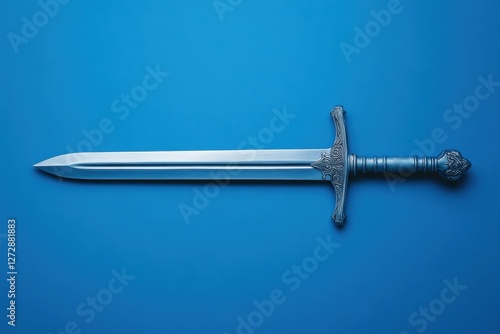 A detailed ornate medieval sword lies on a blue background
