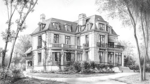 A detailed pencil drawing of a large, stately house with a manicured lawn and trees.