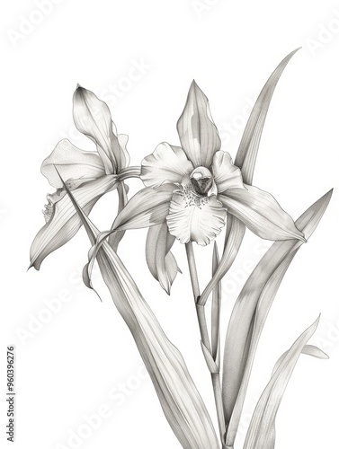 A detailed pencil drawing of two delicate orchids with leaves on a white background.
