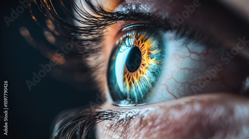 A detailed photo of an eye's colored part, taken up close against a dark backdrop.
