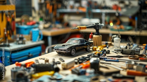 A detailed scale model car workshop with miniature tools, Model car parts and assembly tools organized meticulously, Hobbyist craft style