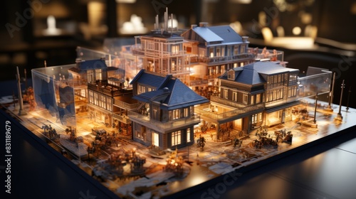 A detailed scale model of an elegant residential development, illuminated warmly
