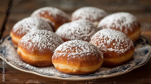 A detailed shot a plate sufganiyot (jelly doughnuts) dusted powdered sugar.