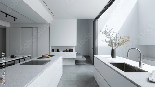 A detailed shot of a minimalist kitchen in a white house, with sleek countertops, minimalist design elements, and ample natural light enhancing the clean aesthetic