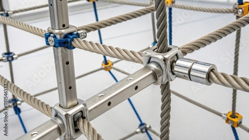 A detailed shot of a modular frame composed of strong metallic connectors displaying various attachment points and hinges. This image highlights the versatility of the components