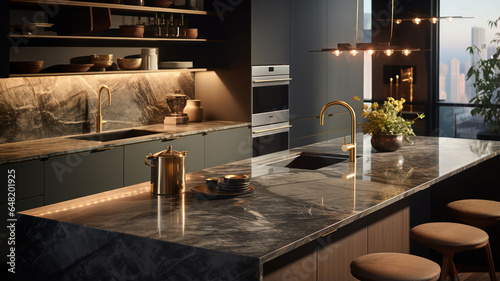 A detailed shot of a sleek, modern kitchen within a high-end penthouse
