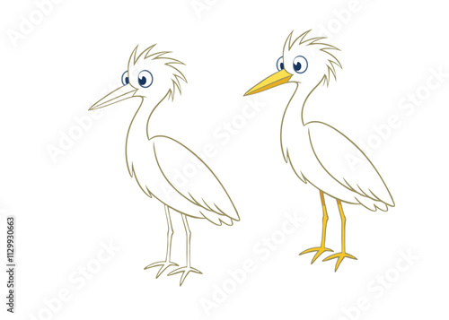 A detailed snowy egret coloring page featuring the elegant bird with long, slender legs, flowing white feathers, and a sharp beak, set against a natural wetland background.