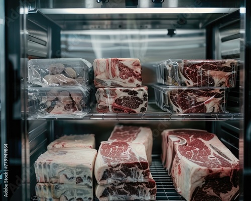 A detailed study of beef aging showcasing different stages of dry-aging in a climate-controlled environment