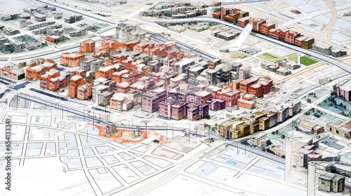A detailed, technical blueprint showcasing urban planning and city zoning. A layout of a city, including residential, commercial, industrial zones and transportation routes and green spaces.