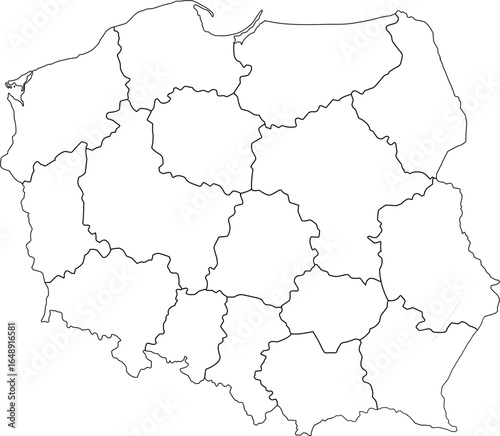 A detailed vector outline map of Poland, clearly showing the boundaries of its 16 provinces. Ideal for educational or data-driven projects