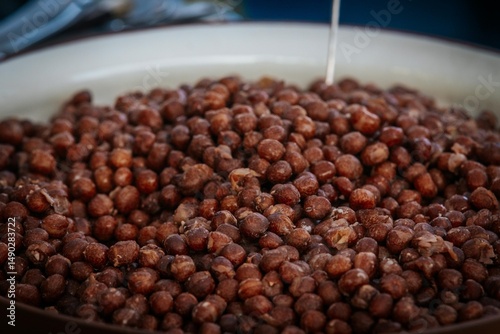 A detailed view of a bowl filled with dried brown peas, showcasing their rough texture and earthy color tones, ideal for natural food and agriculture visuals.