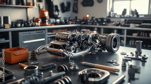 A detailed view of a car's throttle body, placed on a workbench with related components.