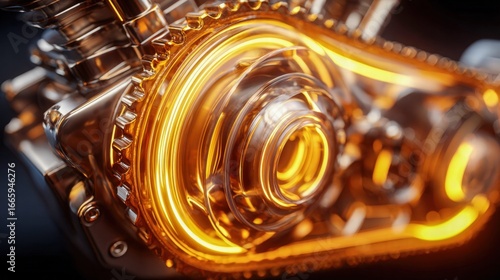 A detailed view of a complex engine part with glowing, intricate metal components.