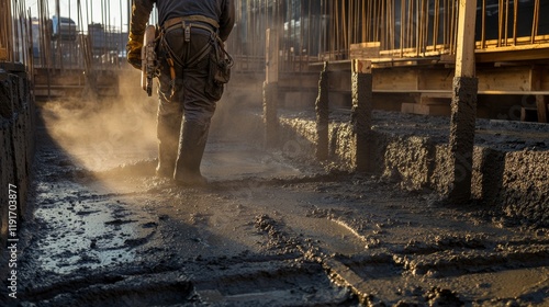 A detailed view of a concrete pump operator directing the flow of concrete into formwork for a building foundation, Concrete pouring scene, Structural foundation style