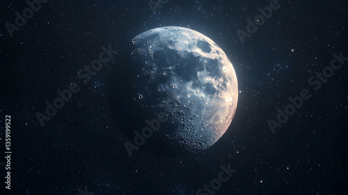 A detailed view of a cratered moon glows against a deep star-speckled space background showcasing its rugged terrain