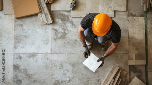 A detailed view of a floor installer in a hard hat and kneepads, holding a tile and looking directly at the camera, with flooring materials around