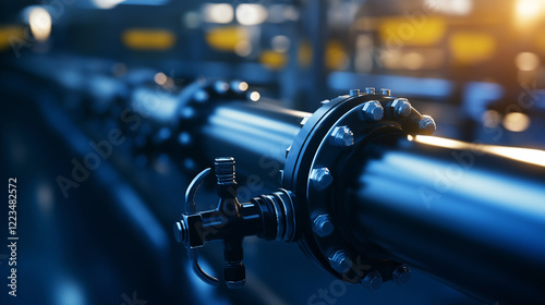 A detailed view of a gas pipeline junction, with welded connections and valve handles, showcasing the precision engineering required for oil and gas production at an industrial sca