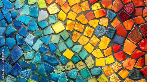 A detailed view of a mosaic tile with vibrant colors and a glossy finish