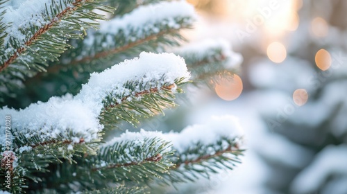 A detailed view of a pine tree's branches and needles covered in fresh snow